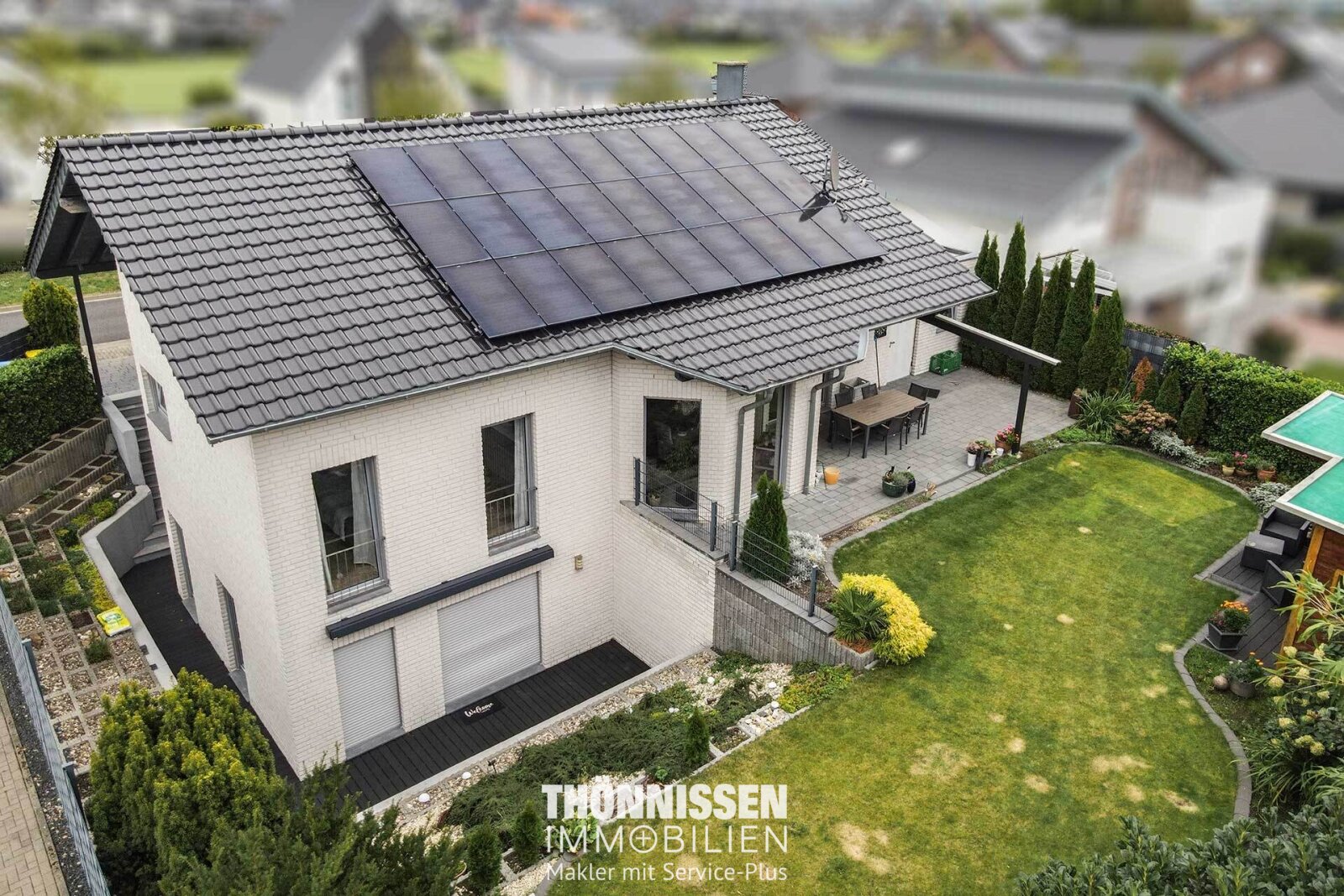 Der Vorgarten überzeugt durch eine pflegeleichte und zugleich repräsentative Gestaltung. Geschmackvoll angelegte Sträucher und Büsche verleihen dem Eingangsbereich einen geordneten und einladenden Charakter, der bereits beim Ankommen ein angenehmes Wohngefühl vermittelt. Das Objekt bietet dank getrennter Eingänge sowohl zum Haupthaus als auch zur Einliegerwohnung ein hohes Maß an Privatsphäre und Flexibilität in der Nutzung. Über den seitlichen Zugang gelangt man zur Einliegerwohnung, die über eine eigene Terrasse mit elektrischer Markise verfügt. Der Hauptgarten ist direkt vom Wohnzimmer aus zugänglich und präsentiert sich mit einer überdachten Terrasse, einer gepflegten Rasenfläche sowie zwei Gartenhäusern – von denen eins als Sauna und eins als Gartengerätehaus genutzt wird.